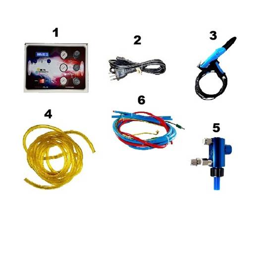 Itens que formam o produto Equipamento Prisma Plus (Fonte + Pistola + Câmara + Chicote + Mangueira)