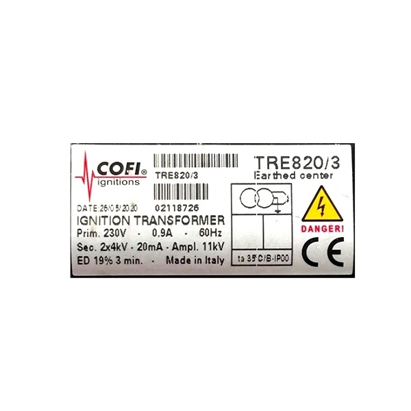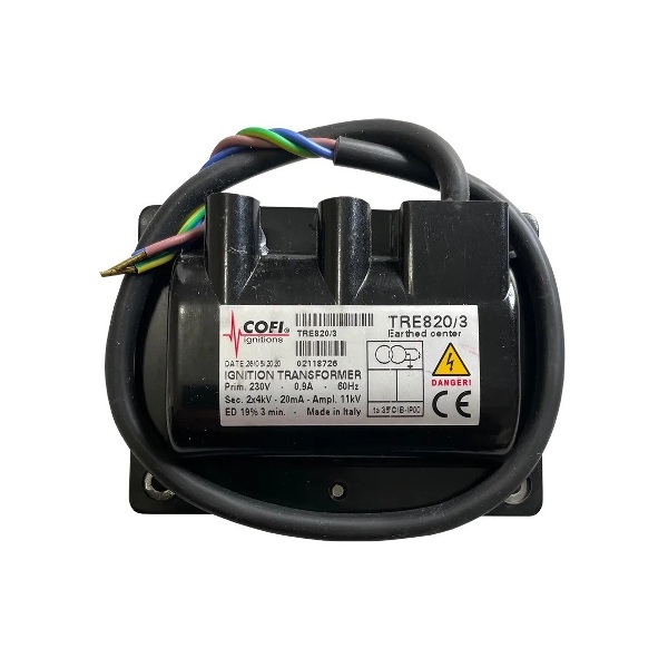 Descrição: O transformador de ignição Cofi TRE820/3 é um componente utilizado em sistemas de combustão industrial, especialmente em queimadores que operam com gás, óleo leve ou pesado.