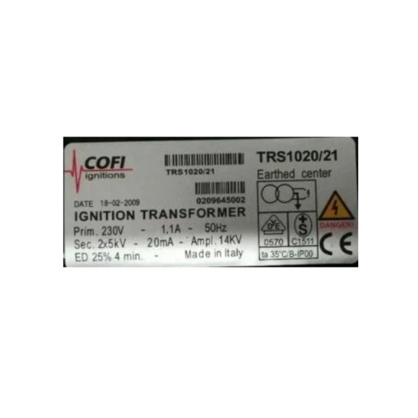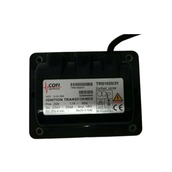 Descrição: O transformador de ignição Cofi TRS-1020/21 é um componente utilizado em sistemas de combustão industrial, especialmente em queimadores que operam com gás, óleo leve ou pesado.