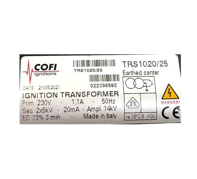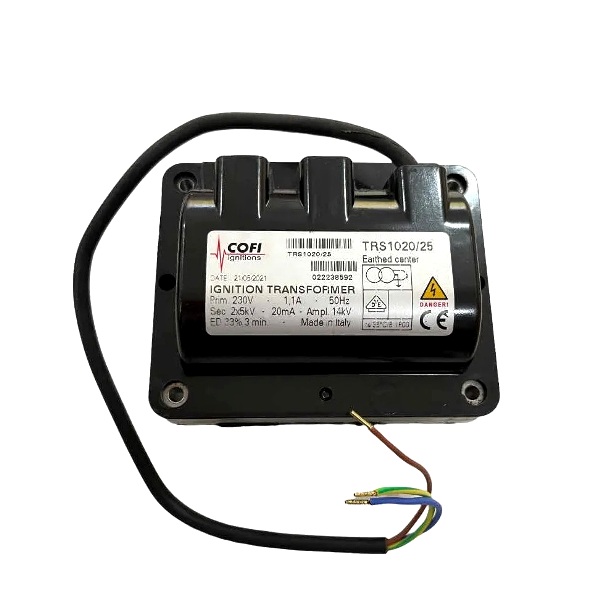 Descrição: O transformador de ignição Cofi TRS-1020/25 é um componente utilizado em sistemas de combustão industrial, especialmente em queimadores que operam com gás, óleo leve ou pesado.