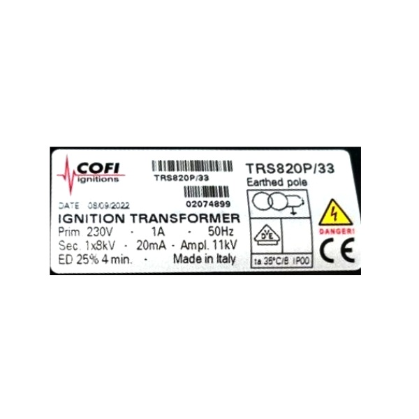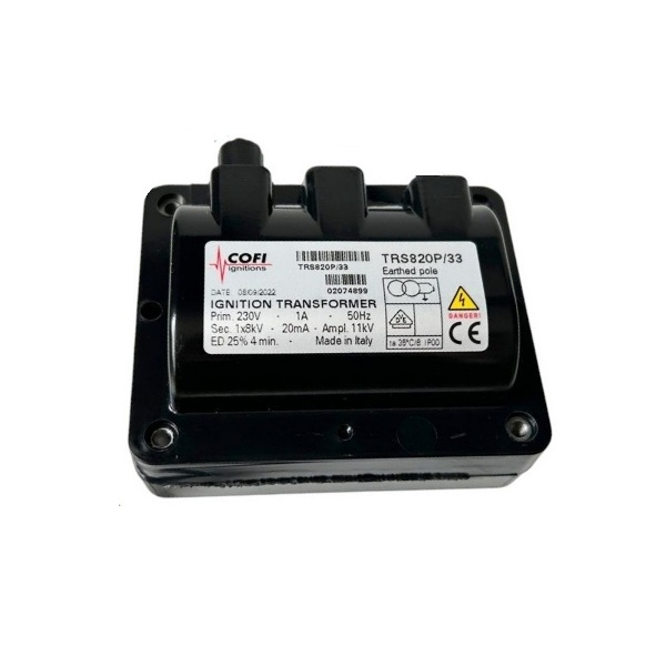 Descrição: O transformador de ignição Cofi TRS-820P/33 é um componente utilizado em sistemas de combustão industrial, especialmente em queimadores que operam com gás, óleo leve ou pesado.