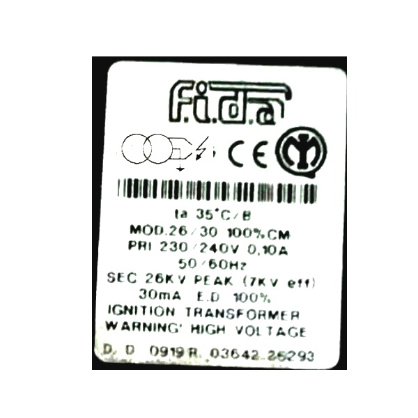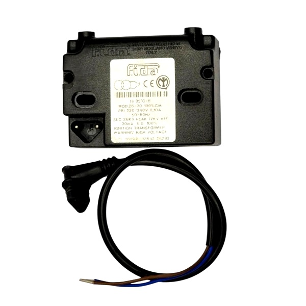 Descrição: O transformador de ignição Fida 26/30 CM é um componente utilizado em sistemas de combustão industrial, especialmente em queimadores que operam com gás, óleo leve ou pesado.