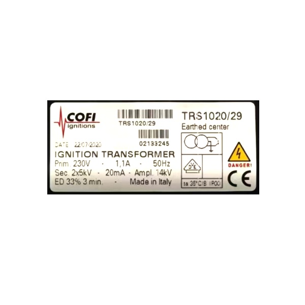 Descrição: O transformador de ignição Cofi TRS-1020/29 é um componente utilizado em sistemas de combustão industrial, especialmente em queimadores que operam com gás, óleo leve ou pesado.