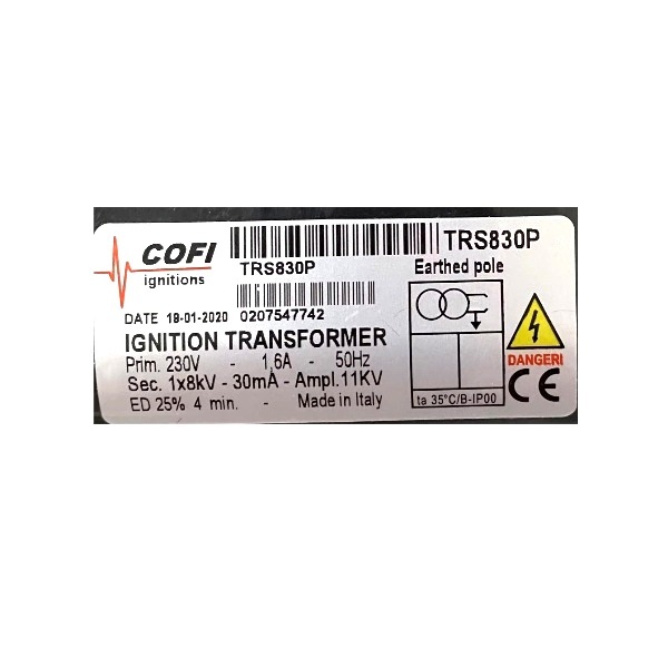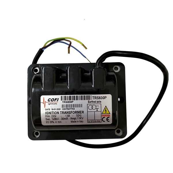 Descrição: O transformador de ignição Cofi TRS-830P é um componente utilizado em sistemas de combustão industrial, especialmente em queimadores que operam com gás, óleo leve ou pesado.