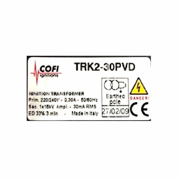 Descrição: O transformador de ignição Cofi TRK2-30PVD é um componente utilizado em sistemas de combustão industrial, especialmente em queimadores que operam com gás, óleo leve ou pesado.